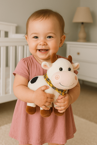 La peluche devient vite le meilleur ami de bébé. Avec son visage attendrissant et son pelage tout doux, cette petite vache au regard malicieux apporte réconfort et sourires à chaque instant.