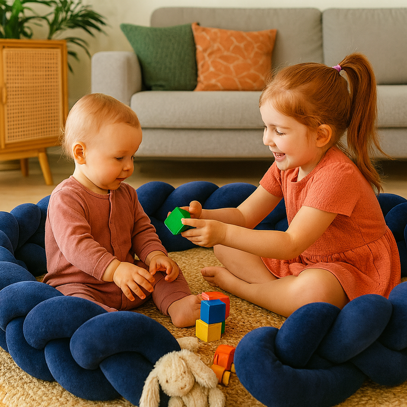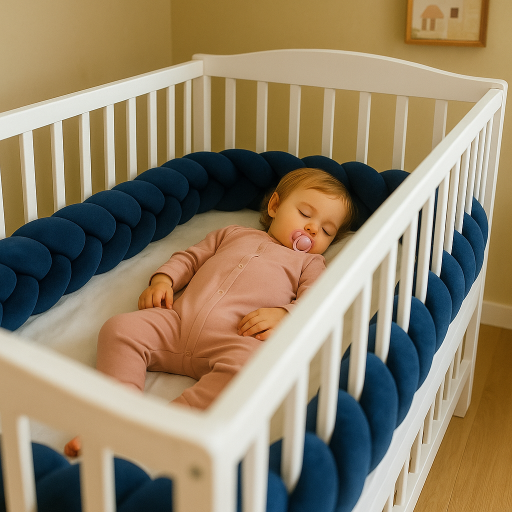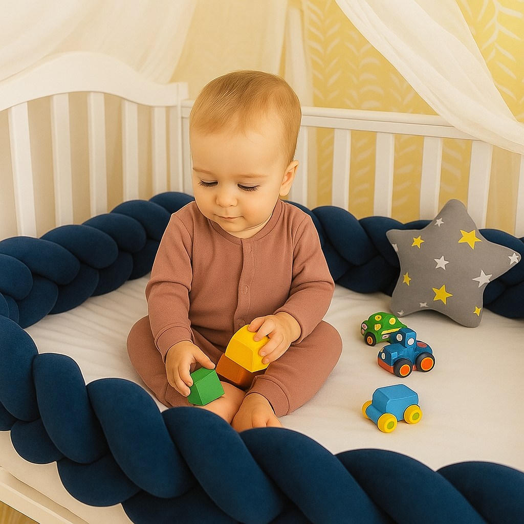 La tresse de lit offre à votre enfant un espace sécurisé, chaleureux et plein de douceur. Son design tressé en velours bleu profond enveloppe le berceau d’une sensation de cocon protecteur, idéale pour les nuits paisibles et les siestes confortables.