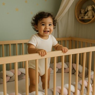 Pour un enfant de plus d’un an, lorsqu’il est bien éveillé et qu'il peut se retourner seul, la tresse de lit apporte une présence rassurante et délimite en douceur son espace de jeu.